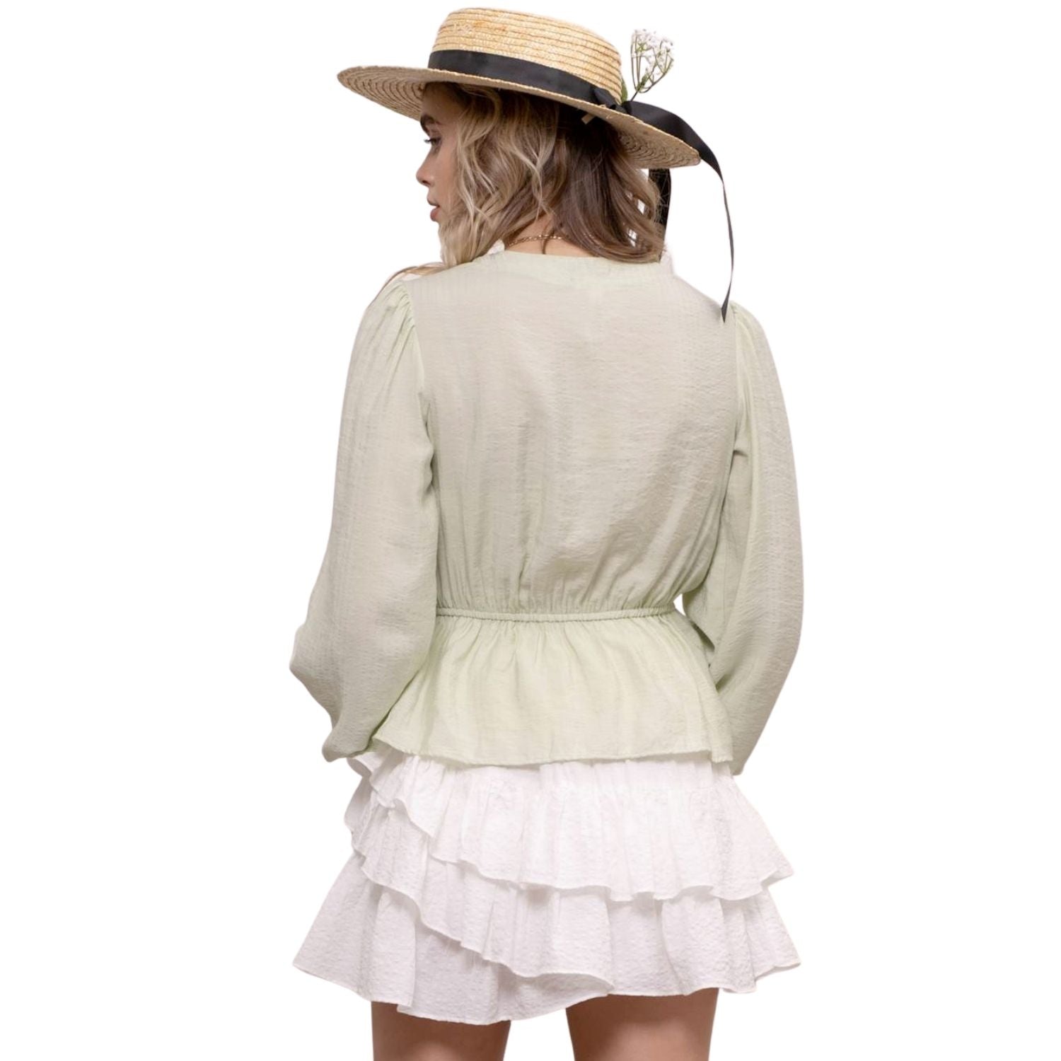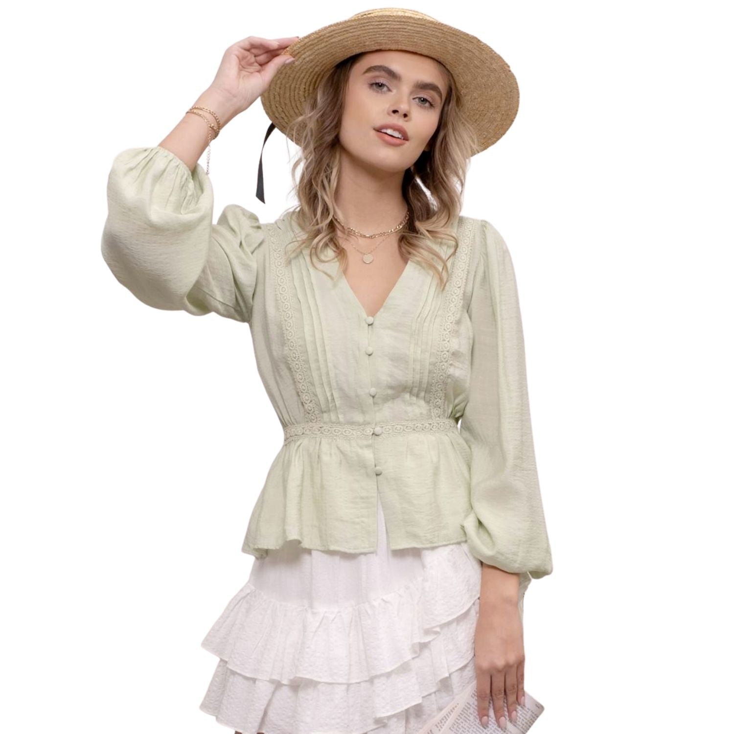 This adorable top with long sleeves, button front and ruffle waist is perfect for summer! The elastic cuffs and lace detail down the front makes this top extra sassy! The lightweight fabric is cool and comfy!
