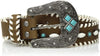 This gorgeous ladies Nocona belt has a modern western flair. It features a brown strap that is accented with white and turquoise stones down the center. The silver buckle is beautifully etched and has 3 turquoise stones. This stunning belt will look good with any outfit, and will certainly get you noticed.