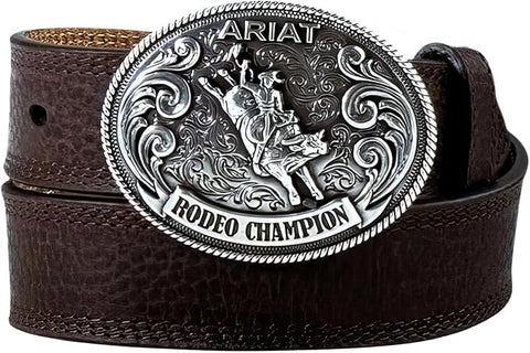 Your future rodeo star will love to wear this Ariat belt. It has a brown classic strap, which will look good dressed up, or playing on the farm. Ariat buckle is dramatic with a bull rider in the center of an etched scroll pattern and the words "Rodeo Champion" on the bottom. This belt will be a favorite for sure.