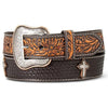 This Ariat men's belt is genuine leather and will look great with any pair of jeans or dress pants. Brown floral embossing on each end of the belt with basket weave and sunburst embossing in the middle. Perfectly accented with antique silver and copper cross conchos down the strap. Floral engraved buckle in antique silver that has a smooth, copper edge.