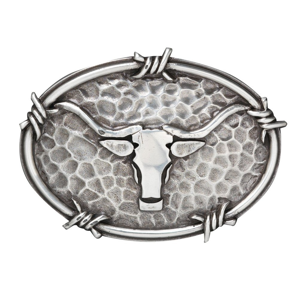 Ariat mens western buckle features a steer head with horns against a hammered antique silver background. The oval buckle has a barbwire edging for an authentic western look.