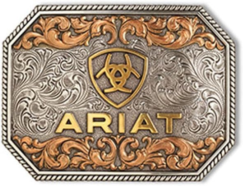 Great Ariat buckle . Rectangle buckle with a rope edge. It features a floral engraved background with a raised Ariat name and logo in antique gold. Antique silver, gold and copper finish.