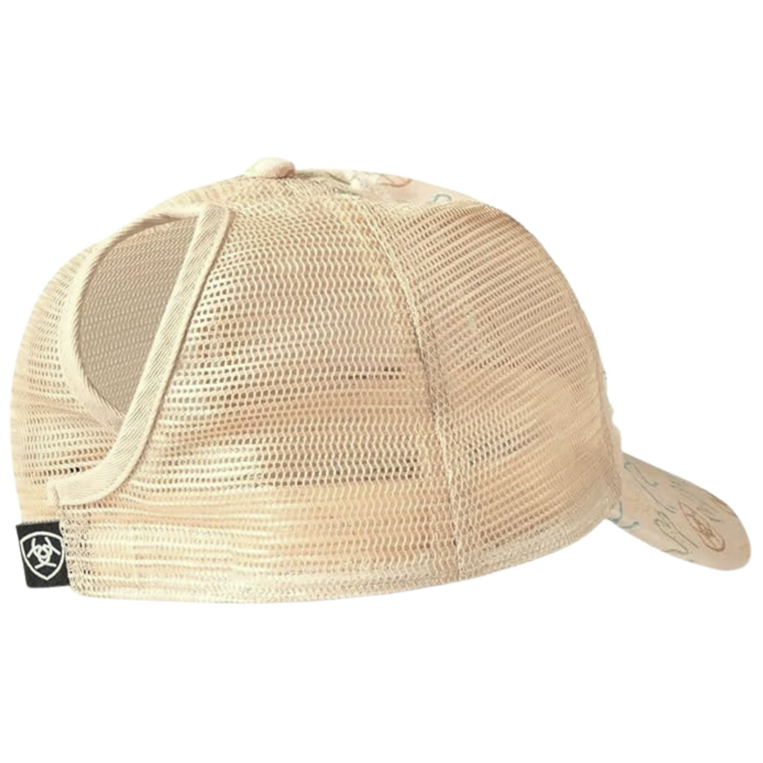 Country looking Ariat ladies cap. Ponyflo cap with pink mesh back with hook and loop closure, and a distressed pink fabric on the front panels and the bill. The fabric features horses, cactus and horseshoes with a large Ariat patch on the front.