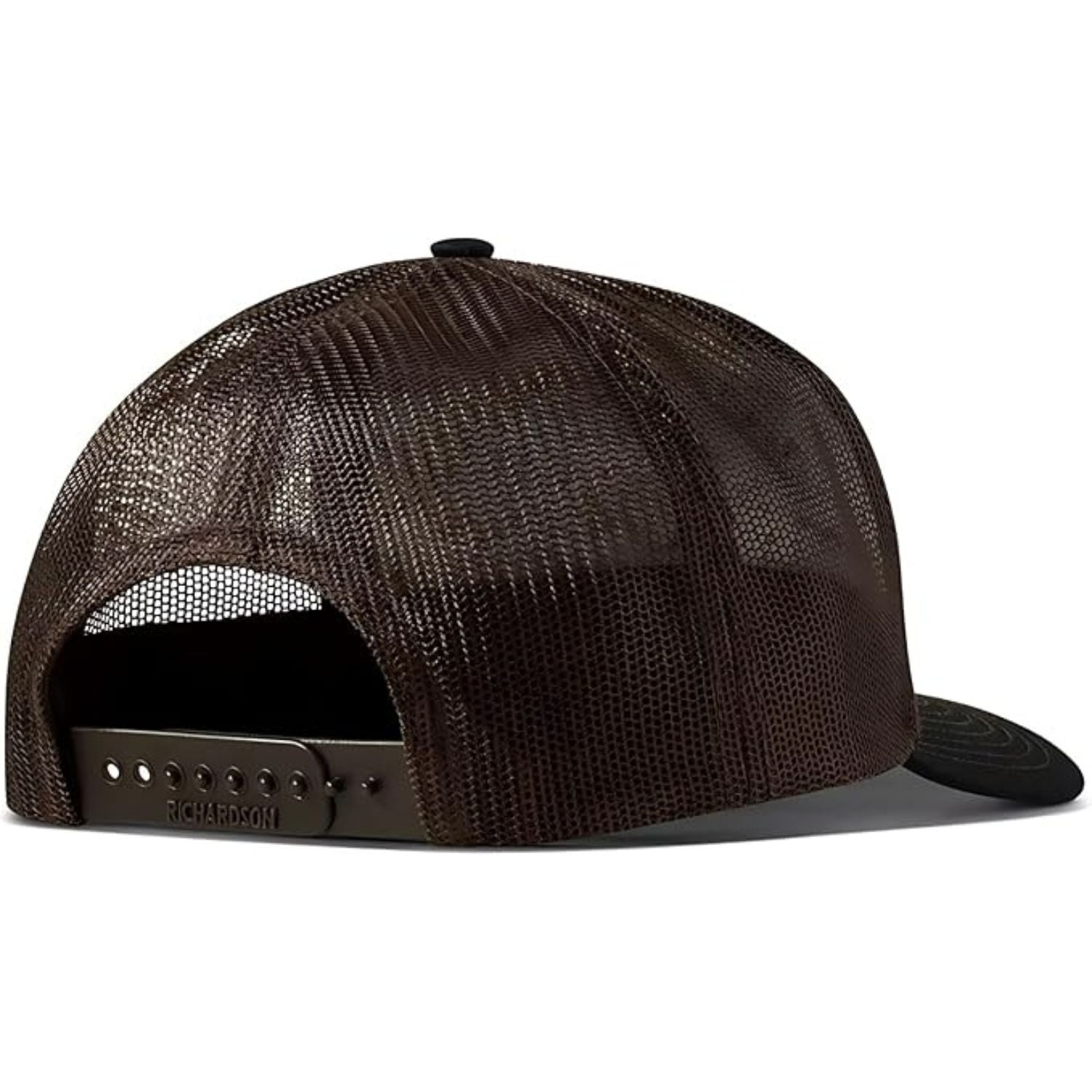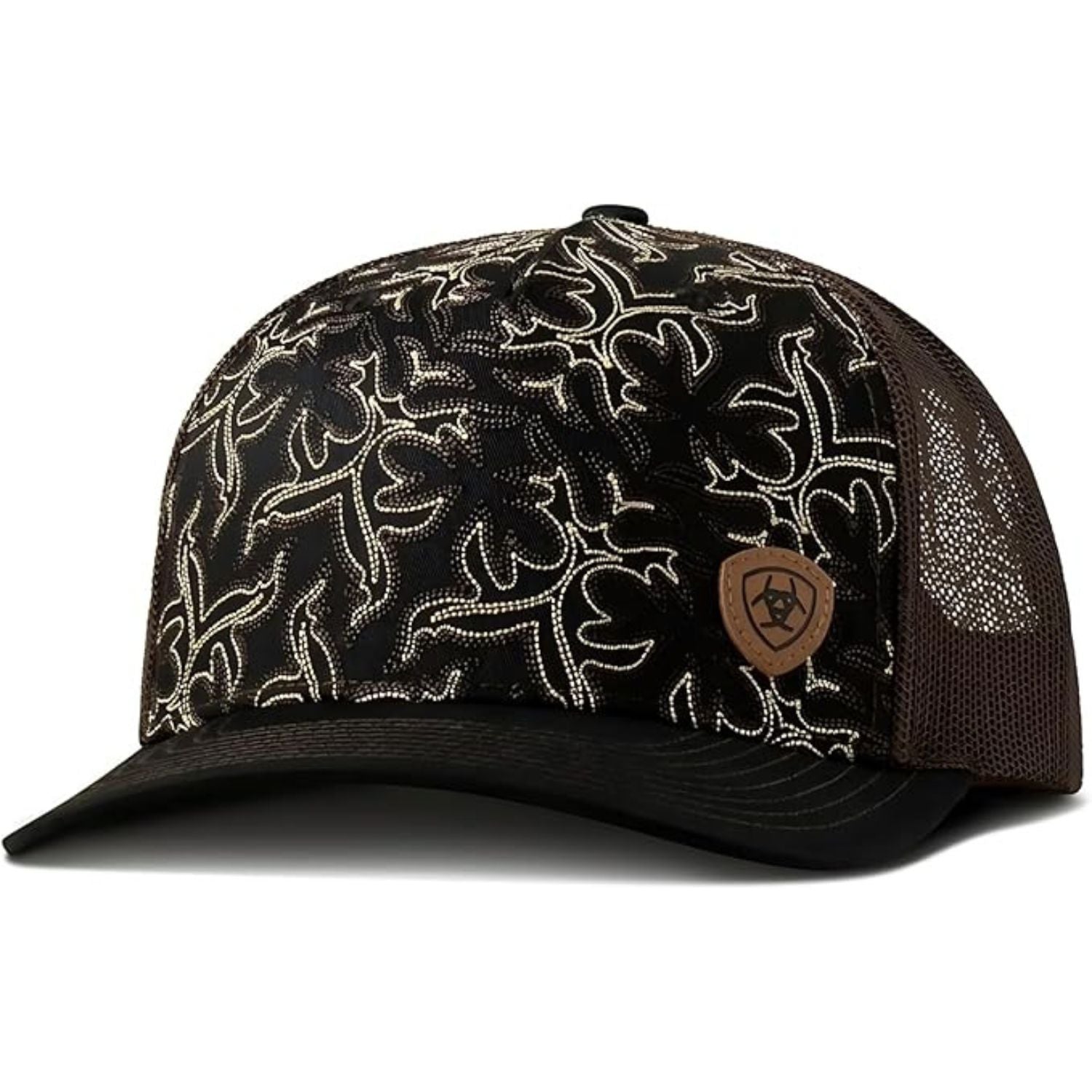 Ariat ladies cap. Black fabric on the front and bill with chocolate and tan stitching on the front panel. Chocolate mesh back and a snap back closure for that perfect fit. Small Ariat shield on the bottom left of the panel.
