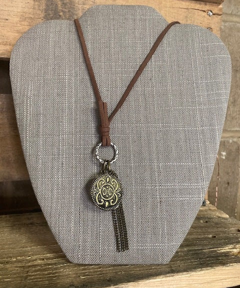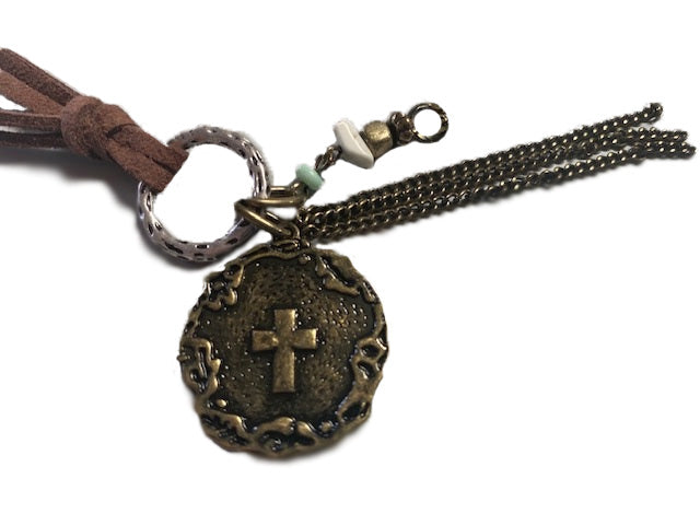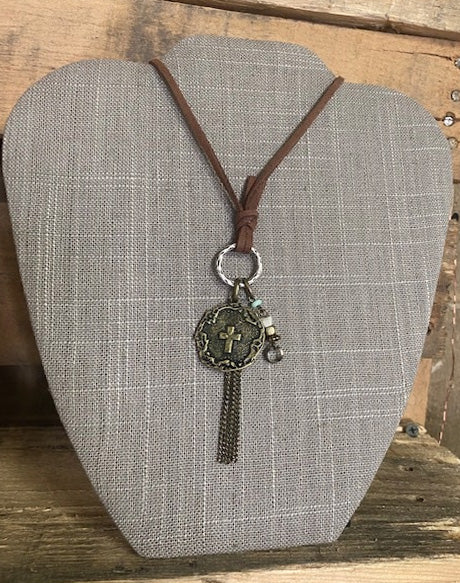 This knotted necklace set by M & F Western Products is very hot! There is a faux leather strap that knots in the front connecting the cross concho pendant. Matching earrings to compliment the necklace are included.