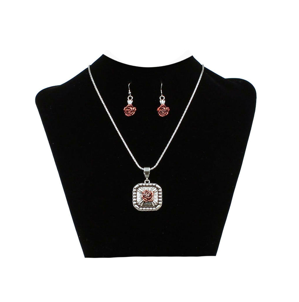 Blazin Roxx necklace set by M&F Western Products features an engraved square pendant accented with a red rose in the center. Includes red rose matching earrings. Fits 16"-20".