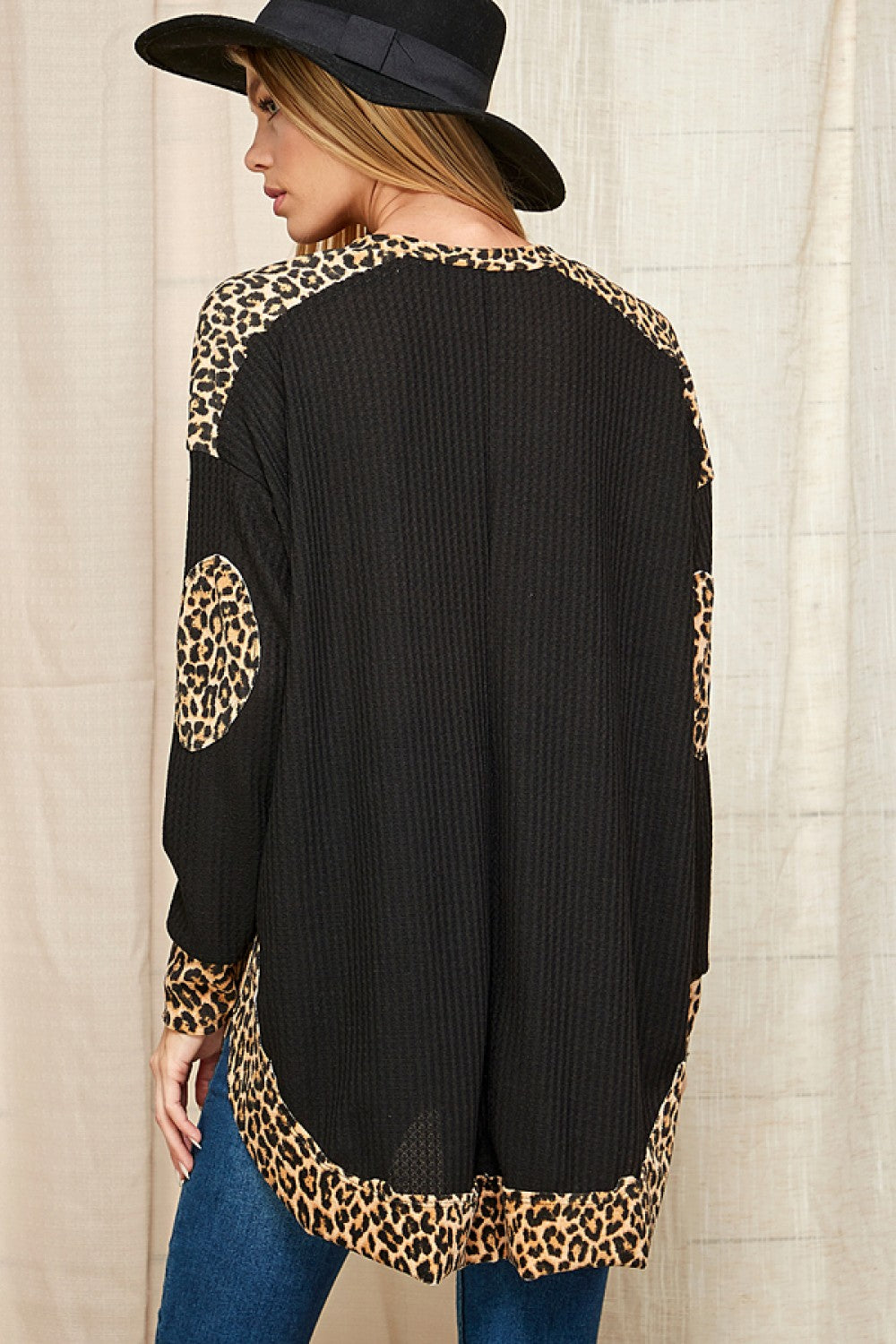 A long sleeve knit top with an open neck featuring a leopard print trim and elbow patches. Fabric is soft and comfortable.