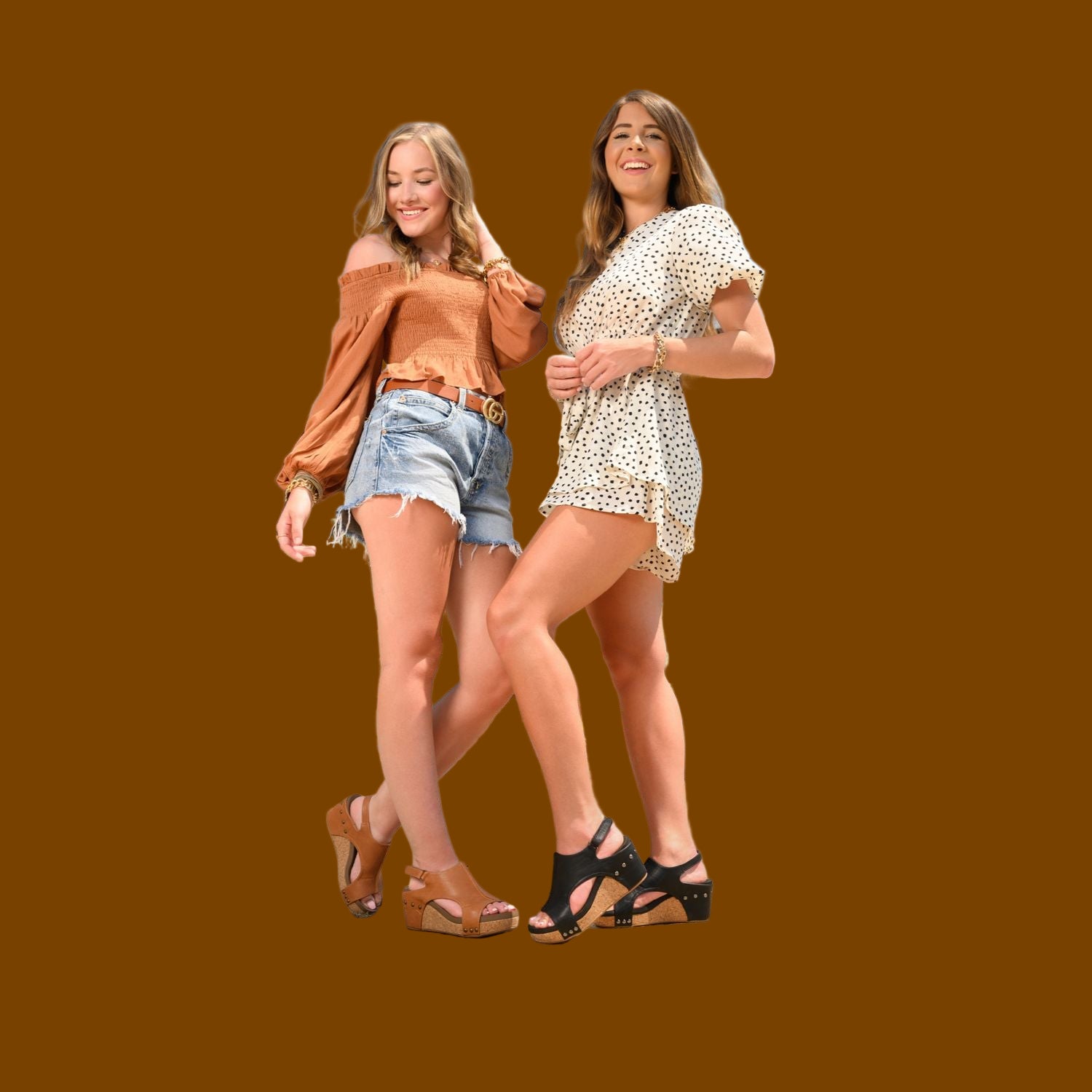 The Carley Wedge Sandal from Corkys is a stylish summer sandal featuring an adjustable slingback design with stud details and a faux leather upper. A cork mid heel wedge and metallic nailhead accents complete this look.