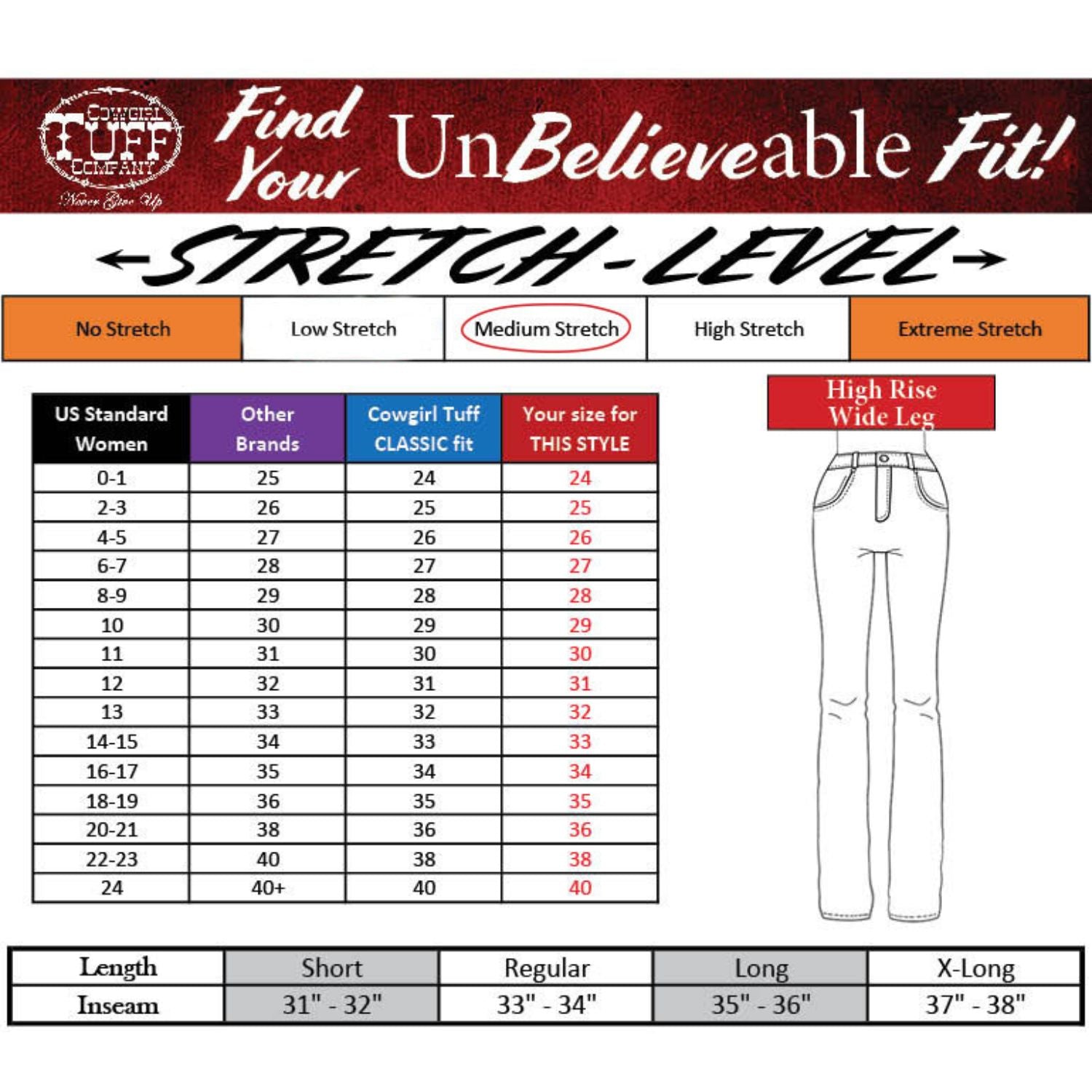 Looking for a clean, dark, classy wide leg trouser? We have you covered with our high waisted Tuff Flex medium stretch jean that looks flattering on many shapes and sizes. They are running generously as they are a more relaxed fit with the wide leg fit.