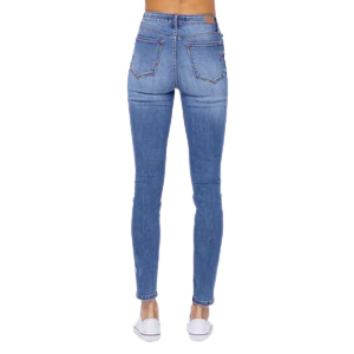 Have a look at these new skinnies! This design is special as it features subtle multi-color embroidery outlining the pockets that add a pop of fun to these jeans! They are a high rise with great stretch and comfort for all-day wear.