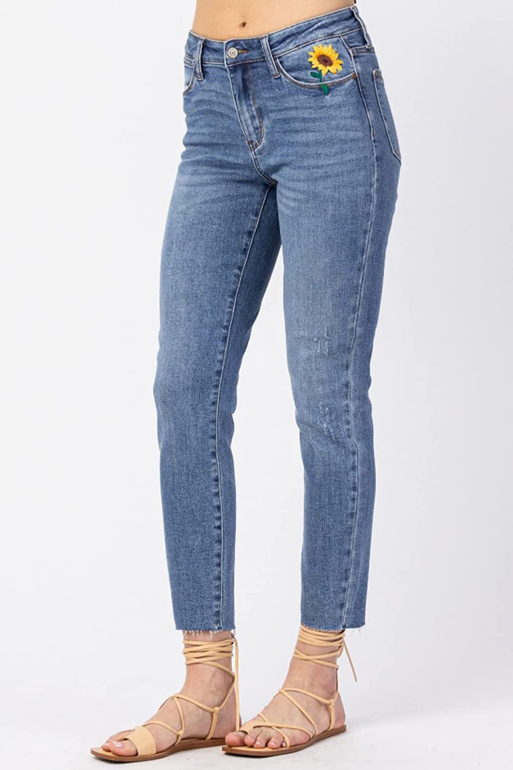 Judy Blue Womens Sunflower Embroidered High Rise Relaxed Fit Raw Hem Jeans