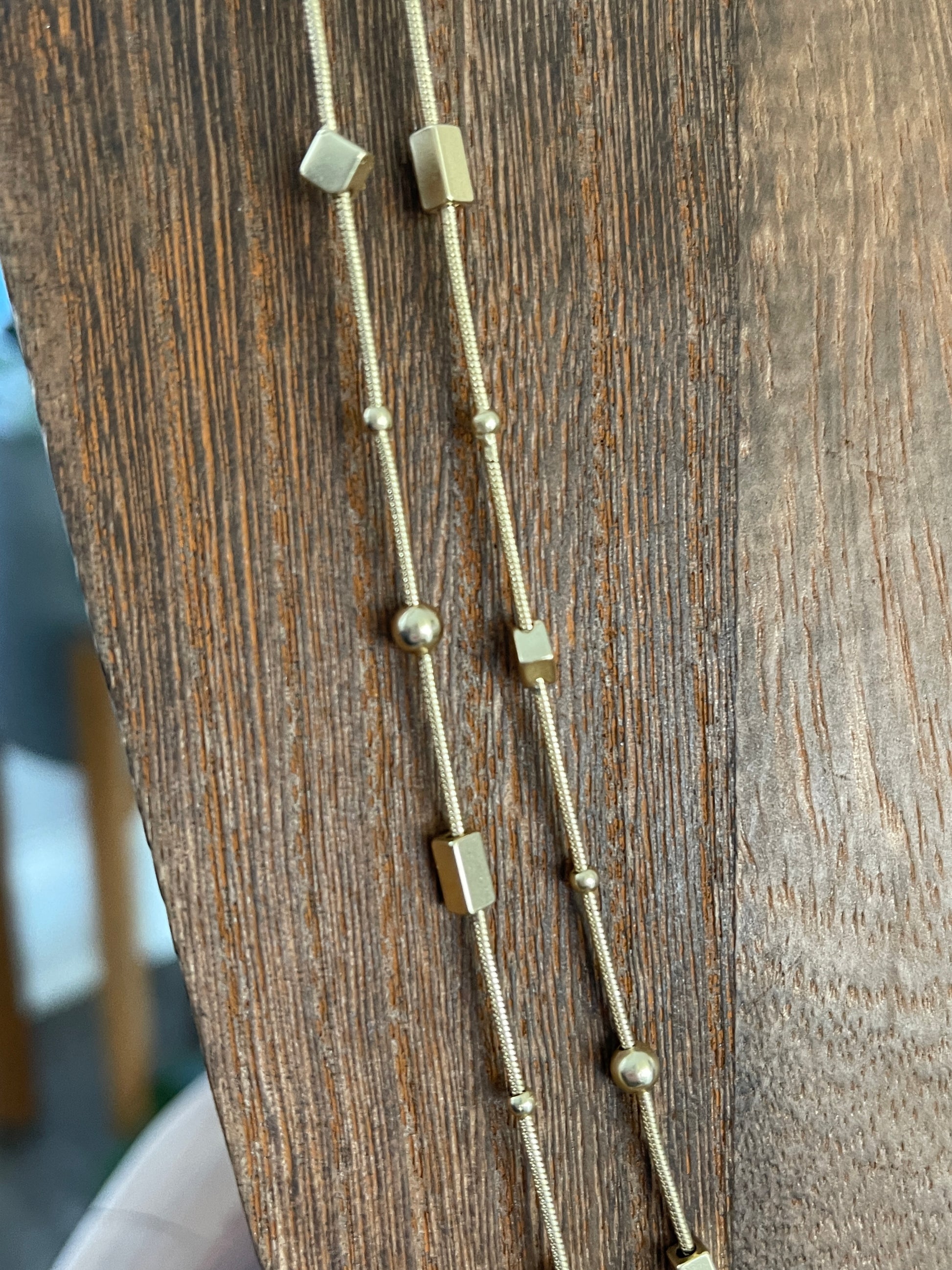 Add the perfect finishing touch to your look with this double chain necklace featuring shapes along the necklace. Shown wrapped once.