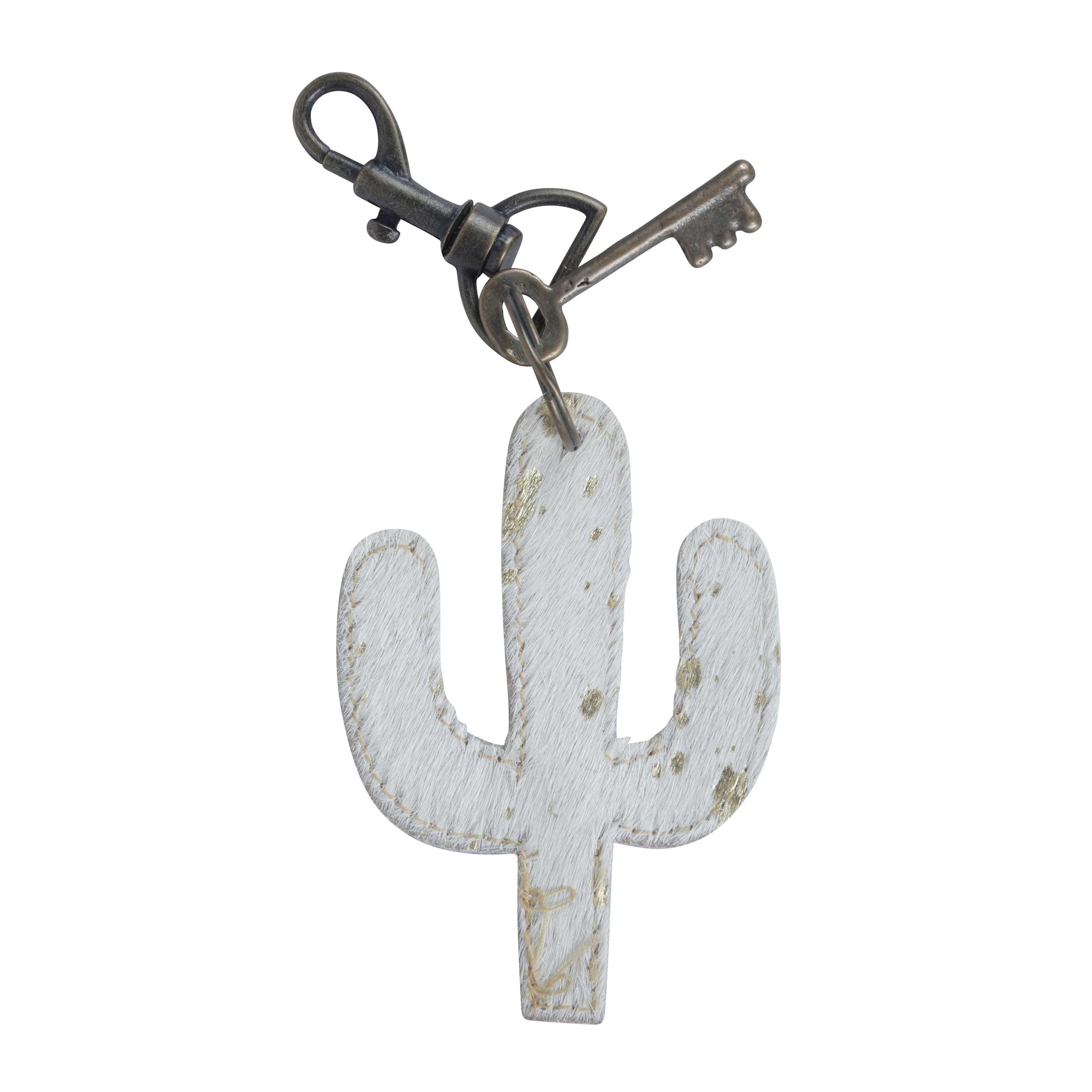 This cactus key fob is made from white cowhide with specks of gold to give it an aesthetic appeal. It has a western hardware embedded with turquoise stone.