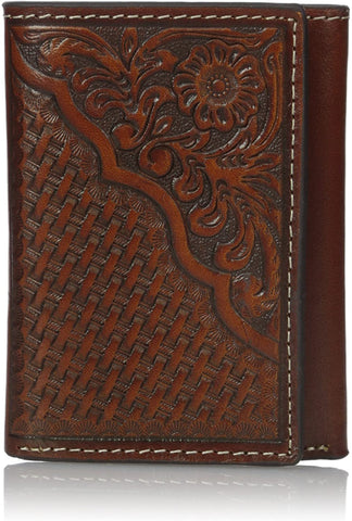 This Nocona Pro tri-fold wallet features a rich full grain leather; and exquisite tooled embossed leather basket weave and floral design.