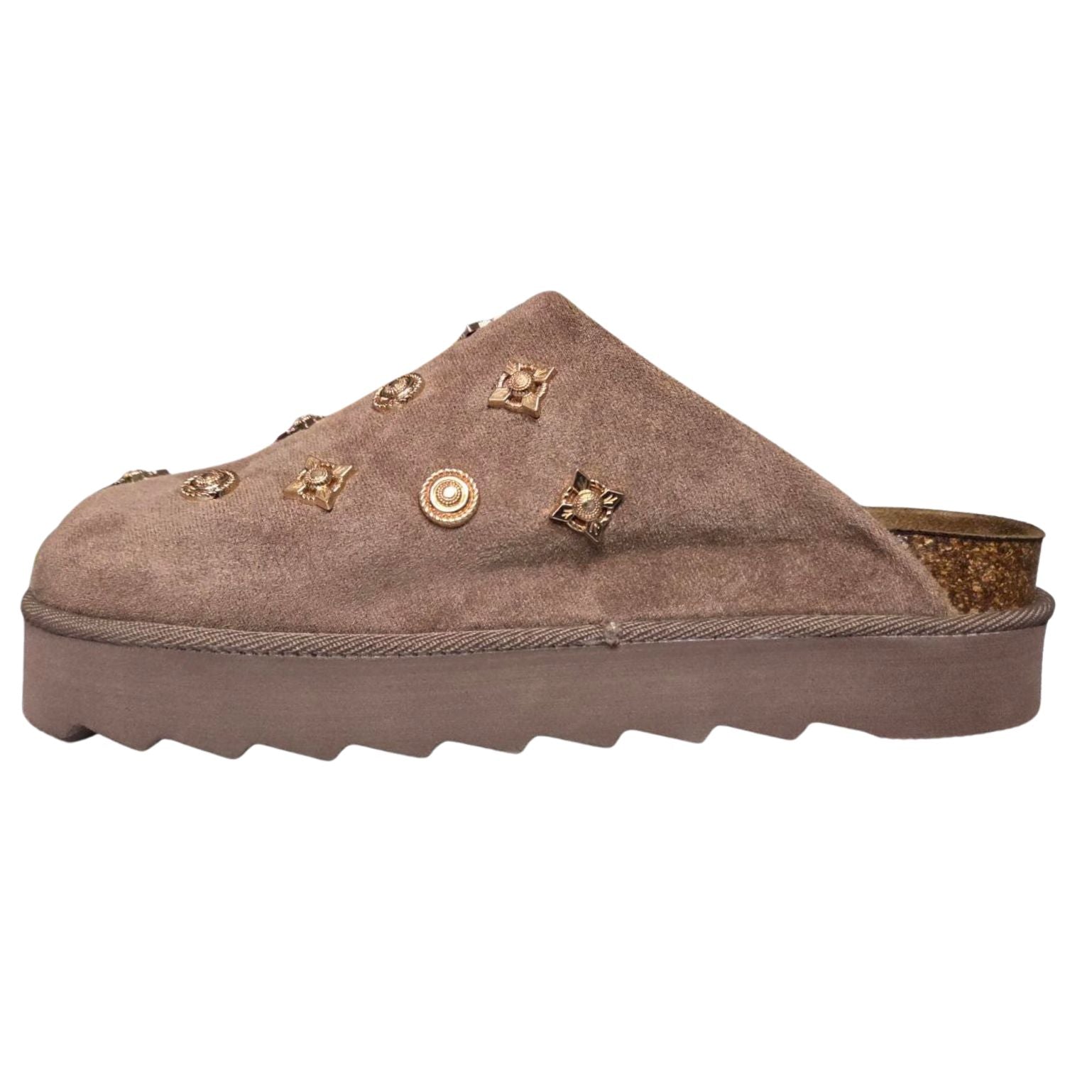 These stylish women's mule slip-ons feature a soft suede upper accented with elegant metallic embellishments. Designed with a cushioned footbed and lightweight platform sole, they offer all-day comfort and easy slip-on wear. Perfect for casual outfits, travel, or adding a chic touch to everyday looks.